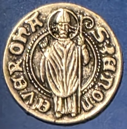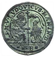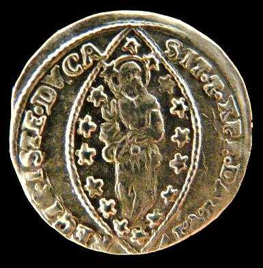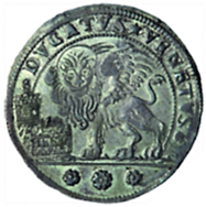 Riproduzione di una moneta antica veneziana realizzata dal Comitato per la celebrazione delle Pasque Veronesi, raffigurante San Marco e il Doge inginocchiato, simbolo della Serenissima Repubblica di Venezia.