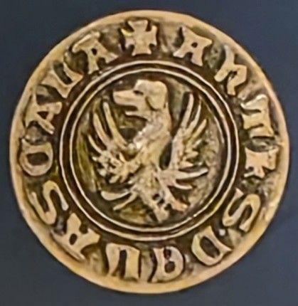 Sul dritto: Elmo con cimiero d’un cane alato, dal quale pende una scala, simbolo della Casata dei Della Scala, col nome del Principe scaligero attorno.