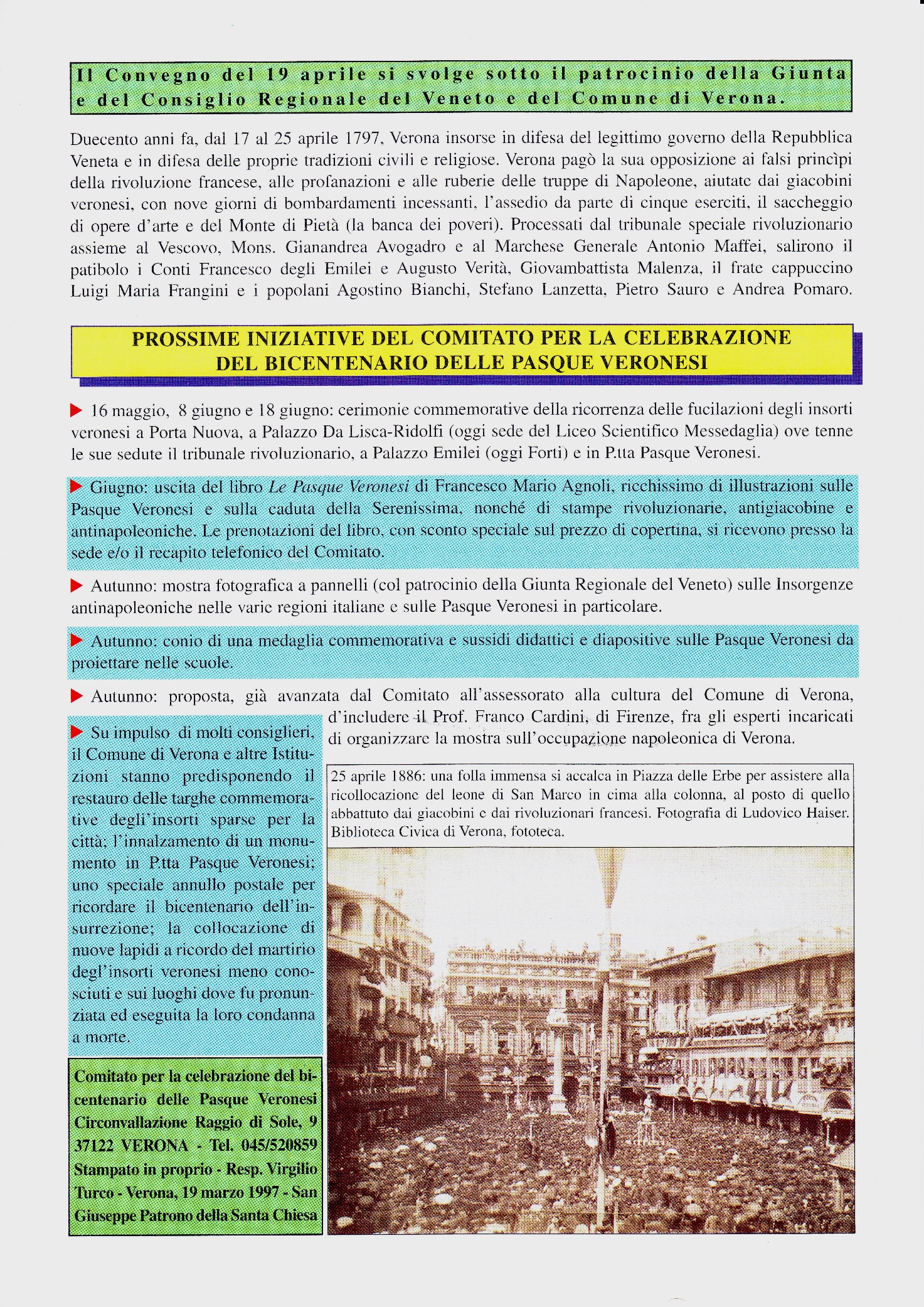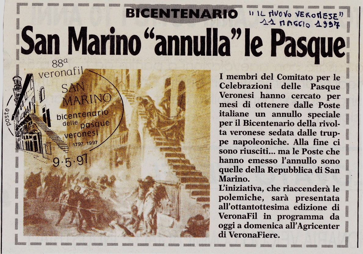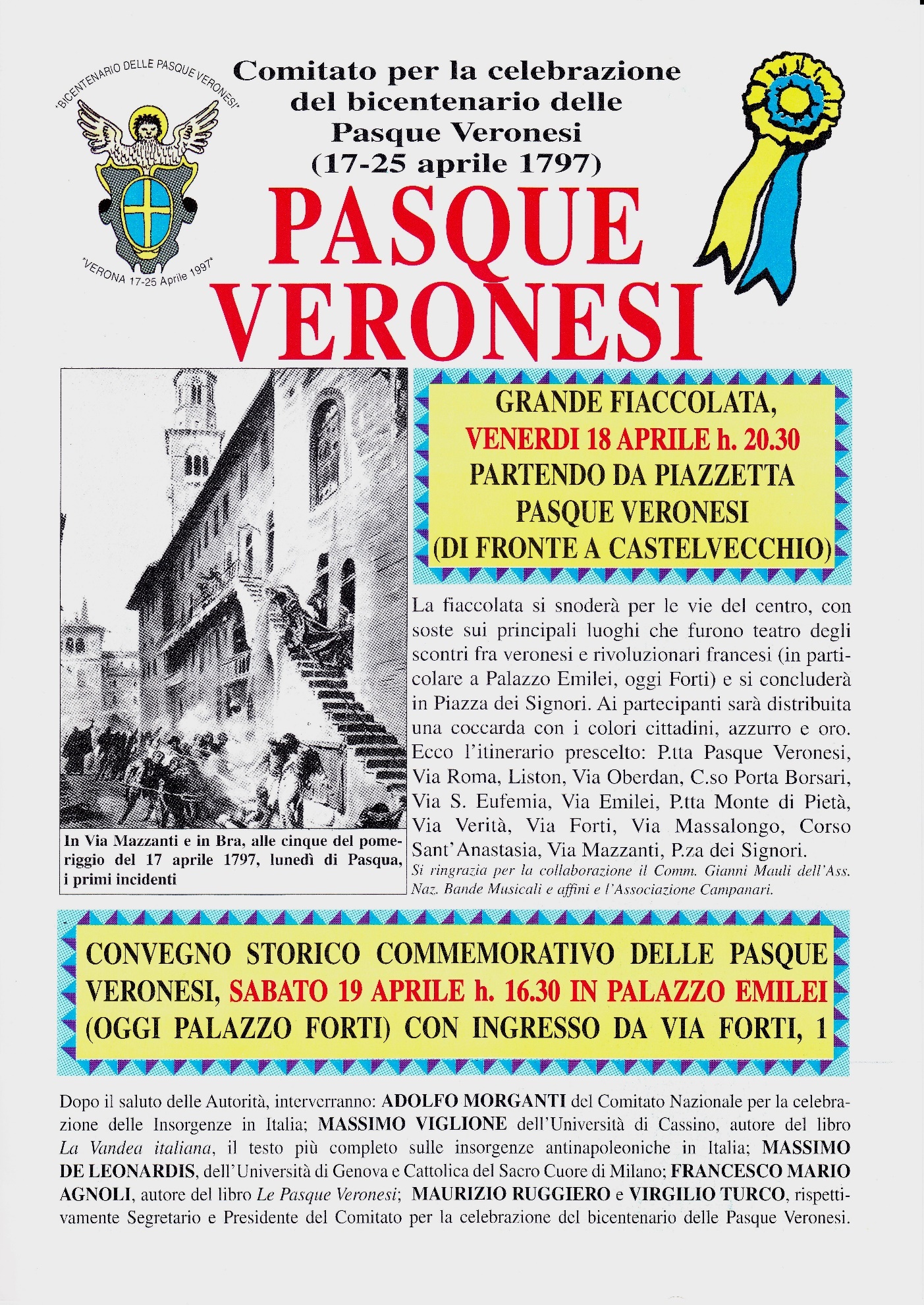 Il 17 aprile 1997, alle ore 17 in punto, in Piazza delle Erbe, a Verona, venne rievocato il bicentenario dell’insurrezione delle Pasque Veronesi, col suono a distesa della cinquecentesca campana del Rengo dalla Torre dei Lamberti.