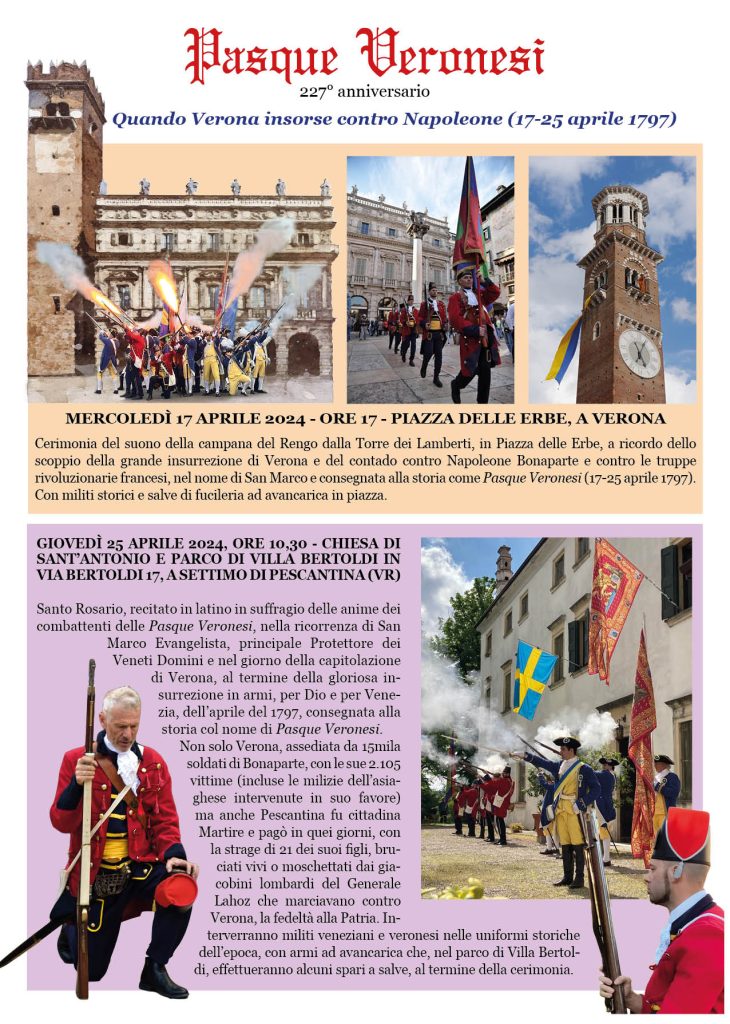 Le manifestazioni celebrative delle Pasque Veronesi 2024 ricordano il 227º anniversario dell’insurrezione di Verona contro Napoleone Bonaparte (17–25 aprile 1797).