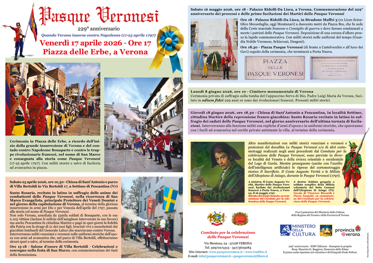 Il Comitato per la celebrazione delle Pasque Veronesi annuncia il programma ufficiale della XXIV edizione delle commemorazioni dedicate al 229° anniversario della grande insurrezione di Verona e del suo contado contro Napoleone Bonaparte e le truppe rivoluzionarie francesi, avvenuta nel nome di San Marco tra il 17 e il 25 aprile 1797 e passata alla storia come Pasque Veronesi.